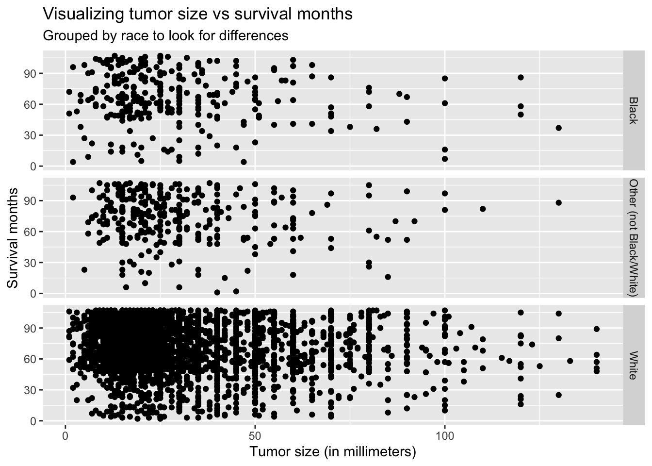 Now, I want to see if there might be a causal relationship between tumor size and survival months, grouped by race. This relationship was highlighted in (Tanvetyanon et al. 2010).